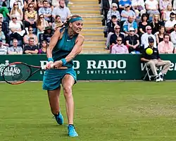 During the grass-court swing, Kvitová competed in Eastbourne where she advanced to the quarterfinals but was then forced to withdraw due to a hamstring injury.[92] Kvitová was seeded sixth at Wimbledon. She won her first two matches easily against compatriot Andrea Hlaváčková and German Mona Barthel. She faced former champion and 30th seed Venus Williams in the third round and was two points away from losing the match but went on to win in three sets. After dismissing Peng Shuai in the fourth round, she beat two more Czechs in the form of Barbora Záhlavová-Strýcová and Šafářová to reach the final. There, she defeated Eugenie Bouchard in straight sets to win her second Grand Slam title.[93][94] She rose to world No. 4 as a result, thus returning to the top 5 rankings for the first time since 2012.[10]