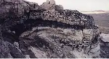 After the arrival of Homo sapiens, humans used bitumen for construction of buildings and waterproofing of reed boats, among other uses.[3] The use of bitumen for waterproofing and as an adhesive dates at least to the fifth millennium BCE in the early Indus community of Mehrgarh where it was used to line the baskets in which they gathered crops.[4] The material was also used as early as the third millennium BCE in statuary, mortaring brick walls, waterproofing baths and drains, in stair treads, and for shipbuilding. According to Herodotus, and confirmed by Diodorus Siculus, more than four thousand years ago natural asphalt was employed in the construction of the walls and towers of Babylon; there were oil pits near Ardericca (near Babylon), as well as a pitch spring on Zacynthus (Ionian islands, Greece).[5] Great quantities of it were found on the banks of the river Issus, one of the tributaries of the Euphrates.