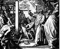 In the Talmud at Shab. 56b the rabbinical defenders of Solomon say that the sin ascribed to him in 1 Kings 11 "is only figurative: it is not meant that Solomon fell into idolatry, but that he was guilty of failing to restrain his wives from idolatrous practices." The Jewish Encyclopedia points out that the opinion "prevalent in rabbinical literature is that Solomon lost his royalty, riches, and even his reason on account of his sins. This legend is based on the words 'I, Kohelet, was king over Israel in Jerusalem' (Eccl. i. 12, Hebr.), which show that when he uttered them he was no longer king. He gradually fell from the highest glory into the deepest misery. At first, Solomon reigned over the inhabitants of the upper world as well as over those of the lower; then only over the inhabitants of the earth; later over Israel only; then he retained only his bed and his stick; and finally his stick alone was left to him (Sanh. 20b)."[9] Rabbi Pinchas Frankel places the blame of this fall on Solomon's wife Pharaoh's daughter. He bemoans her arrival to Solomon's court for "Unlike Pharaoh's daughter in the Story of the Exodus, who raised and developed [Moses] the Leader of the People of Israel, this daughter of Pharaoh will have the opposite effect upon this Leader of Israel, causing his level of spirituality to fall to the point where he will have to temporarily abandon the kingship."[11]