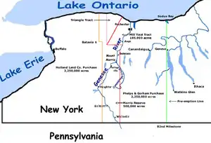 The Fort Stanwix Treaty and earlier treaties established the approximate western boundary, but a survey was required to establish the exact line.[6] Phelps believed that the line ran through Seneca Lake and included the former Cayuga settlement of Kandesaga, present-day Geneva, New York. He planned to make Geneva the headquarters and location of the land sales office. He hired Col. Hugh Maxwell, a man of high reputation, to perform the survey. During his original survey for Phelps and Gorham, Maxwell was assisted by Augustus Porter and other surveyors.[8]