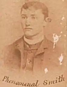 Smith spent most of the 1885 and 1886 seasons playing with the Newark Little Giants of the Eastern League. He appeared in 20 games as a pitcher for Newark in 1885 and struck out 214 batters.[3][4] As of 1921, the only pitchers to have attained an average of 10 strikeouts per game were Smith (1885), Baseball Hall of Fame inductee John Clarkson (418 strikeouts in 41 games in his first minor league season) and Eddie Knuff (390 strikeouts in 39 games for Memphis, 1886).[4] He reportedly received the nickname "Phenomenal" after pitching a no-hitter against Baltimore on October 3, 1885. Only two batters reached base, one on an error and one on a base on balls, and Smith picked off both runners at first base.[2]