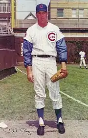 Regan provided similar heroics for his new team. In his first two appearances as a Cub, he saved both games of an April 28 doubleheader with the Houston Astros.[16] Despite missing the first 14 games of the Cubs' schedule, Regan led all of Major League Baseball with 25 saves in 1968 on his way to capturing a second Sporting News Reliever of the Year Award.