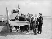 Hunter joined the Royal Air Force, passing out from the Royal Air Force College Cranwell as a probationary pilot officer on 11 September 1931.[5] He completed his flying training at No. 5 Flying Training School (Sealand). On 29 August 1932 he joined No. 25 Squadron RAF based at RAF Hawkinge, flying Hawker Fury Mark Is.[6] On 11 September 1932 he was confirmed in his rank as a pilot officer.[7] On 28 February 1933 he was posted to No. 6 Squadron RAF, then based at Ismailia in Egypt, flying Fairey Gordon light bombers and was promoted to flying officer on 11 April 1933.[8] He was promoted to flight lieutenant on 11 April 1936,[9] and returned to England and joined the staff of the Royal Air Force College Cranwell on 9 November 1936. He was then posted to the Central Flying School at RAF Upavon as a Senior Instructor. He was promoted to squadron leader on 1 December 1938.[10][11] His biography has recently been published in the "Fighter Leaders" collection volume 2.[12] and his flying logbook and medals donated to the Kent Battle of Britain Museum.