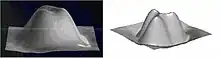 An image of benzene by tunneling microscopy: on the left, the experimental image; on the right, the calculated image.