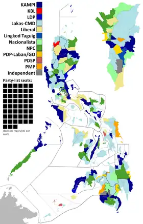 The administration's two main parties, Lakas-CMD and Kabalikat ng Malayang Pilipino (KAMPI), was seen to win majority of the seats, with most contests contested by the two parties. This inevitably produced a split in the administration ranks on who would be their candidate for Speaker in the impending victory. However, the two parties were united in supporting President Arroyo and were able to prevent any impeachment proceeding against her or her allies from reaching the Senate.