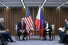 The Philippines–United States relations refers to the bilateral and diplomatic relations of the Republic of the Philippines and the United States of America. The relationship between the United States and the Philippines has been historically strong; often described as a "special relationship."[1] The former Philippine president Rodrigo Duterte, however, was supportive of a foreign policy that was less dependent on the United States, favoring one that prioritized closer relations with China and Russia,[2] despite the Philippines and the U.S. having a mutual defense treaty dating from 1951 to the present. In 2014, the countries signed an enhanced defense cooperation agreement that began its first phase of implementation in 2019.