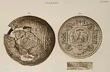 In 1855 and 1876, two ancient tombs were uncovered in Palestrina (ancient Praeneste), around 30 km east of Rome – the Barberini Tomb and the Bernardini Tomb.[19][1] They contained a number of silver bowls, including one with a detailed Phoenician inscription that was published a few years later as CIS I 164.[20] Following the Bernardini tomb discovery, archaeologist Wolfgang Helbig published a letter he had written to Sardinian antiquarian and politician Giovanni Spano, who had himself published the Pauli Gerrei trilingual inscription about 15 years previously. The letter was entitled Notes on Phoenician Art, and included a detailed survey of all the Phoenician metal bowls that had been found to date.[18]