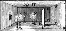 Lambert's book is fundamentally experimental. The forty experiments described in Photometria were conducted by Lambert between 1755 and 1760, after he decided to write a treatise on light measurement. His interest in acquiring experimental data spanned several fields: optics, thermometry, pyrometry, hydrometry, and magnetics. This interest in experimental data and its analysis, so evident in Photometria, is also present in other articles and books Lambert produced.[9] For his optics work, extremely limited equipment sufficed: a few panes of glass, convex and concave lenses, mirrors, prisms, paper and cardboard, pigments, candles, and the means to measure distances and angles.