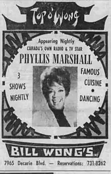At the age of 15 years, Marshall made her singing debut on Toronto radio station CRCT, and later performed on CBC Radio with Percy Faith.[1] She performed in the Silver Slipper nightclub in Toronto in September 1938.[4] Throughout the 1930s and 1940s she sung jazz, both with the Cab Calloway Orchestra touring through the US and on stage in Toronto.[4] Starting in 1949 and through until 1952, she was a regular performer on the CBC Radio show initially called Blues for Friday later called Starlight Moods.[1] In 1959, she appeared on a BBC television show The Phyllis Marshall Special.[1]