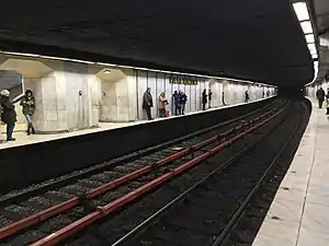 According to Sorin Călinescu, one the three planners of the station, when shown the plans for the Line M2 in 1985, First Lady Elena Ceaușescu reportedly demanded the station's removal. According to some of the people who worked on the station, Ceaușescu was supposedly concerned that workers and students were starting to gain weight and needed more exercise. The engineers realized the station would be necessary, and Sorin Călinescu claimed they have built it in secret.[1] Because of this, the platforms are somewhat asymmetrical, very narrow (less than 1.5 m wide) and the waiting area is in a corridor separated by thick walls from the platforms in order to sustain the station's structure.