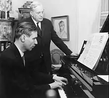 The Western radio premiere of the sonata was played by Vera Brodsky and broadcast on CBS on September 29, 1943. This had been preceded in the afternoon of that same day by a private performance that afternoon for invited critics and musicians.[18] That broadcast was followed by the Western concert premiere at Carnegie Hall on October 24 played by Brodsky. Her performance was part of a concert of Soviet music held under the auspices of the American Russian Institute, which sought to improve cultural relations between the United States and Soviet Union. It also included the Western premieres of three songs from the Six Romances on Verses by British Poets, sung by Alexander Kipnis. Donald Ogden Stewart was the master of ceremonies for the concert, whose audience included Andrey Gromyko.[19]