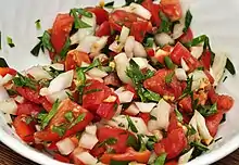 Pico de gallo (Spanish pronunciation: [ˈpiko ðe ˈɣaʝo], lit. 'rooster's beak'), also called salsa fresca ('fresh sauce'), salsa bandera ('flag sauce'), and salsa cruda ('raw sauce'), is a type of salsa commonly used in Mexican cuisine. It is traditionally made from chopped tomato, onion, and serrano peppers (jalapeños or habaneros may be used as alternatives), with salt, lime juice, and cilantro.