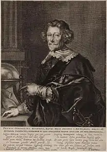 Cornelis is mentioned in Houbraken's Schouburg as being one of the many teachers of Joachim von Sandrart in 1640-41, though considering Sandrart's age and experience (he had just returned to the North from his Grand Tour to Italy), this was more of a collaboration.[2] Since Filippo Baldinucci later wrote a biographical sketch on Pietro Danckerse de Ry in his list of artists called the Notizie,[3] it is possible that Danckerts visited Italy at some time. In any case Sandrart engraved some of Peter's paintings after this period.[1] Between 1634 and 1638 he moved to Warsaw, and later Danzig, and Vilnius in the Polish–Lithuanian Commonwealth. Here he was the court painter and architect of King Władysław IV Vasa.[1] According to Houbraken a poem was written in his honor that applauds his work in Poland.[2]