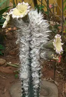 Pilosocereus leucocephalus, called old man cactus (along with a number of similar species), old man of Mexico, tuno, and woolly torch, is a species of cactus in the genus Pilosocereus, native to Mexico and Central America.[2] It has gained the Royal Horticultural Society's Award of Garden Merit.[3] Pilosocereus leucocephalus functions as a keystone species in dry landscapes found in Mesoamerica. The fruit this cactus produces is relied upon as a source of hydration and sugar in arid areas by frugivores such as birds, bats, and even some reptiles.[4]