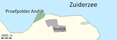 The pilot Polder Andijk, or Test Polder Andijk, Proefpolder Andijk in Dutch, is a polder established in 1926 - 1927 in the Zuiderzee near the village of Andijk. The aim of this prototype is to study the embankments and agriculture for future polders in the Zuiderzee Works.[1] In 1929, the pilot polder was inaugurated by Queen Wilhelmina of the Netherlands.