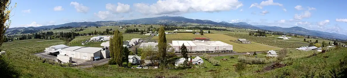 Pine Grove was a station on the Mount Hood Railroad and was named for a stand of timber that once existed at this locale.[1] In 1886, German immigrant Peter Mohr planted 400 apple trees in the Pine Grove area, in what was probably the first commercial orchard in the Hood River Valley planted on dry land and relying solely on irrigation.[2] Pine Grove was also one of the primary communities in the Hood River Valley farmed by Nikkei—Japanese migrants and their descendants.[3]