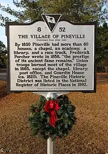 Pineville Historic District is a national historic district located at Pineville, Berkeley County, South Carolina. It encompasses seven contributing buildings and illustrates Pineville's original role as a 19th-century pineland village, and its gradual transformation to agricultural land and to a year-round community in the late-19th and early-20th centuries. The Pineville Historic District consists of four principal buildings, three residential buildings and one Episcopal church, ranging in date from about 1810 through 1925. The architectural styles represented include Federal, Greek Revival, and Bungalow. In the mid to late-19th century, Pineville was a densely settled village that included as many as one hundred buildings, including an academy, racetrack, library, churches, and residences. Much of the town was burned by Union troops at the close of the American Civil War in April 1865. In the years following the war, much of the land that made up the village was converted for use as farmland. Since that time, Pineville has remained a small community of less than 20 structures surrounded by open farm and hunting lands.[2][3]