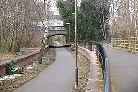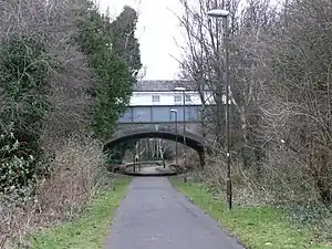 Platforms beside the trackbed which is now a cycle path. The former ticket office sits above the bridge