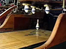 - Ball return – removes the bowler's ball from the lane's pit and returns it to the bowler via the ball return track, located between paired lane beds, back to the ball return unit at the heads of the lanes. The ball lift is designed to separate the ball from the fallen pins in the pit, and does not send pins into the ball return track. The track is normally below the lane, although earlier pinsetters (both mechanical and automatic) have above-lane tracks similar to those of older manual lanes. Above-lane ball returns remain in use today as a low-cost alternative for miniature arcade bowling lanes, which use scaled-down balls and pins.