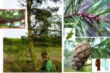 Pinus × rhaetica, commonly known as Rhætic pine, the species name refers to the Rhætica alps, located in eastern Switzerland and western Austria. Rhaetic pine is described as a natural hybrid of Mountain pine (Pinus mugo) and Scots pine (Pinus sylvestris). It is a coniferous tree nothospecies located in the subsection Pinus.[3]