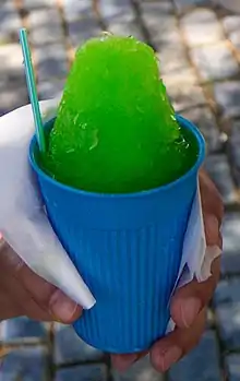 A piragua Spanish pronunciation: [piˈɾa.ɣwa][1] is a Puerto Rican shaved ice dessert, shaped like a cone, consisting of shaved ice and covered with fruit-flavored syrup. Piraguas are sold by vendors, known as piragüeros, from small, traditionally brightly-colored pushcarts offering a variety of flavors. Besides Puerto Rico, piraguas can be found in mainland areas of the United States with large Puerto Rican communities, such as New York and Central Florida.
