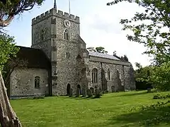 The church, rebuilt in 1877, but with the remains of its 12th-century tower, is built within the bailey of a former castle, Toot Hill.[2] Pirton Grange, which was remodelled in the 18th century, is in the north of the parish, and is a particularly interesting, moated Elizabethan house with a timber-framed gatehouse. Hammonds Farm and Rectory Farm, with its tithe barn, are also Elizabethan.