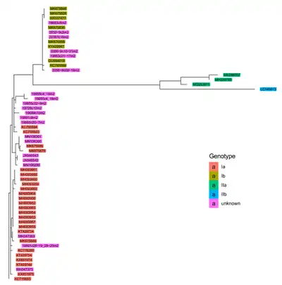 Piscine orthoreovirus has been grouped into multiple different genotypes based on sequence diversity. Although multiple ways of subdividing PRV have been proposed,[3] the system most often used in the literature subdivides PRV into Genotypes I and II, which are further divided into Ia and Ib, and IIa and IIb, respectively.[17][2][18][19] These divisions and subdivisions are based on sequence diversity within segment S1.[18][8]