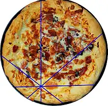 Let p be an interior point of the disk, and let n be a multiple of 4 that is greater than or equal to 8. Form n sectors of the disk with equal angles by choosing an arbitrary line through p, rotating the line n/2  1 times by an angle of 2π/n radians, and slicing the disk on each of the resulting n/2 lines. Number the sectors consecutively in a clockwise or anti-clockwise fashion. Then the pizza theorem states that: