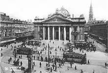 The Place de la Bourse was laid out following the covering of the river Senne (1867–1871), as part of the major urban works by the architect Léon Suys under the tenure of the then-mayor of the City of Brussels, Jules Anspach.[2][3] Centrally located halfway down the Boulevard Anspach/Anspachlaan (then called the Boulevard Central/Centraallaan), it served as the focal point of Suys' sanitation and beautification programme for the city.[4] The development work on the entire district began in 1868 and the Brussels Stock Exchange building was inaugurated in 1873.[5]
