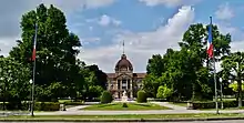 The Place de la République is a square (four sides of identical lengths) surrounding a circular public garden crossed by a north-west and a south-east axis.[1] The area was originally occupied by a section of the city walls, which were demolished after the Franco-Prussian War. An ancient Jewish cemetery was located on grounds near to the river; it is assumed to be the place where the Jews of Strasbourg were burned at the stake in 1349.[2]
