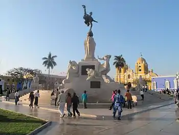 Martin de Estete began the design of the streets of Trujillo by order of Diego de Almagro in the end of the year of 1534, so he designed the structure and dimensions of the Plaza de Armas. In 1841, Pedro de Mandalengoitia Sanz de Zarate donated to the square a fountain made of white stone that was built on his farm and mill in Santa Cruz de Carabamba.[1] On December 29, 1820, the Plaza de Armas was the scene of the proclamation of Independence of Trujillo by the Marquis of Torre Tagle. In this square are located the cathedral of the city and mansions dating back to the Hispanic and republican periods. On July 4, 1929, in the middle of this square, the Freedom Monument was opened, which represents the country's independence process and according to "commentators it represents the most precious of human beings, the love of freedom, the memory and recognition of the distinguished men who gave us independence". The statue was a work in Germany,[2] the materials used are marble and copper, the sculptor was Edmund Moeller and it was armed by Henry Albrecht.