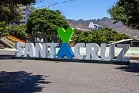 A large sign of the tourist brand of the city (introduced in September 2016) is located at one end of the plaza, adjacent to the lake. The sign reads "Santa Cruz", short for the tourist slogan of "Santa Cruz, el corazón de Tenerife" - "Santa Cruz, the heart of Tenerife". The letters are white except for the last "a" of the word Santa, which is an inverted blue heart, on top of which is an upright green heart. Erected in December 2016, the structure is 11.1 metres (36 ft) long and 1.4 metres (4.6 ft) high (double that height at the hearts). It is made of galvanised steel with epoxy paint.[4] The sign is repainted in different colors and with different symbols during important events.[5][6]