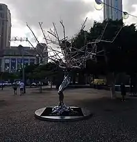 Sculpture by the Basque artist Julio Nieto and located in the center of the square next to its artificial lake. It is a piece of stainless steel, five meters high and 450 kilos in weight with the appearance of a man in the shape of a tree that symbolizes "the optimism of the human being, who, despite all his thoughts, takes it well".