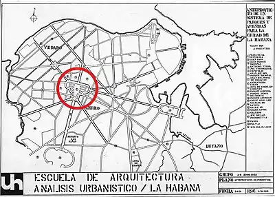 The location of the monument was agreed according to the opinion of Fulgencio Batista in the Loma de Los Catalanes, taking into account the urbanization studies of the architect Jean-Claude Nicolas Forestier in 1926 that pointed to the site as ideal for a larger city. [lower-alpha 1] It would be the center of a system of avenues and squares, surrounded by public buildings. The avenues were programmed to connect Vedado with Cerro and Jesús del Monte, as planned by the architects Otero, Varela and Labatur. It would be like the center of a system of avenues and squares, surrounded by large public buildings, such as the National Library, various Ministries, a Museum, the School of Fine Arts, and others. And that was exactly what was done to give birth to the famous Plaza Civica, which is its real name.