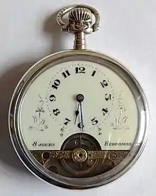 An 'Hebdomas' 8 day pocket watch, circa 1920, Musée d'Horlogerie of Le Locle, Switzerland. Patented in 1889, discontinued a number of years and reintroduced in 1968 is still manufactured.[12] An example of the decline and resurgence of the pocket watch.