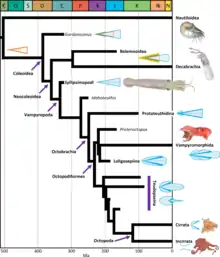 When looking at the groups Teudopsidae, Trachyteuthididae, the Vampyromorpha, cirrate octopods, incirrate octopods and the fossil Loligosepiina, the describing authors proposed that Pohlsepia mazonensis would be most closely related to the octopods based on its lack of a shell.[5]