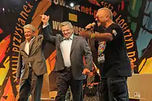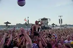The festival was initiated in 1994 by Jerzy Owsiak after his trip to the United States where he attended the Woodstock Festival, which was held after a 25-year hiatus.[8] The festival's official motto is Love, Friendship, Music.[9] The event is held by the Great Orchestra of Christmas Charity as a way of thanking its volunteers. Generally a weekend-long event, its two stages are in continuous use from early afternoon to dawn, featuring performances by around 30 bands every year. Many Polish musicians and bands have made several appearances, including IRA, Decapitated, Myslovitz, Maria Peszek, Kamil Bednarek, Dżem, Acid Drinkers, Lessdress, Hey and Riverside. International bands are also invited every year – Skunk Anansie, Sabaton, Judas Priest, Within Temptation, Shaggy, The Stranglers, Papa Roach, The Prodigy, Kaiser Chiefs, Ugly Kid Joe, You Me at Six, Guano Apes, Kontrust, Clawfinger, Nigel Kennedy, Gentleman, Korpiklaani among many others.[10] Festival promoters also aim to promote emerging talent – and a competition is held prior to the festival, and the winners are given a chance to perform at the festival. The main musical theme is generally rock, but genres range from folk through experimental to metal. Recent years have also seen reggae, electronic music and even classical music represented.[11][12][13]