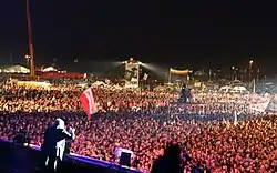 Pol'and'Rock Festival, formerly known as Woodstock Festival Poland, (Polish: Przystanek Woodstock; "Woodstock Station"; English-language materials often referred to it simply to the Woodstock Festival Poland) is an annual free rock music festival in Poland, inspired by the Woodstock festival. The festival has been held since 1995. In 2009 Woodstock Festival Poland gathered an audience of over 400,000 people,[1] in 2011 the attendance was above 700,000,[2] in 2012 about 550,000 people,[3] in 2013 about 500,000[4] and in 2014 the attendance reached a record high of about 750,000.[5] As of 2019, the aggregate attendance of the festival is 750,000 making it one of the biggest music festivals in the world.[6][7]