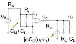 which is simply the previous Miller capacitance evaluated at low frequencies. On this basis is determined, provided >> . Because CM is large, the time constant is much larger than its original value of Ci ( RA || Ri ).[7]
