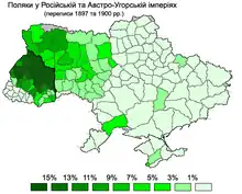 Due to assimilation, whereas at the time of the annexation of Ukrainian lands by Russia in 1795 10% of the population were Poles,[16] in spite of ongoing migration of Poles from central Poland into Ukrainian lands,[11] by the end of the nineteenth century only three percent of the total population of these territories reported that Polish was their first language.[16]