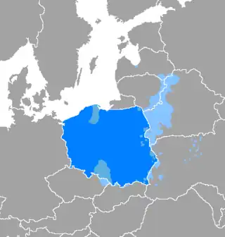 Tomasz Kamusella notes that "Polish is the oldest, non-ecclesiastical, written Slavic language with a continuous tradition of literacy and official use, which has lasted unbroken from the 16th century to this day."[40] Polish evolved into the main sociolect of the nobles in Poland–Lithuania in the 15th century.[39] The history of Polish as a language of state governance begins in the 16th century in the Kingdom of Poland. Over the later centuries, Polish served as the official language in the Grand Duchy of Lithuania, Congress Poland, the Kingdom of Galicia and Lodomeria, and as the administrative language in the Russian Empire's Western Krai. The growth of the Polish–Lithuanian Commonwealth's influence gave Polish the status of lingua franca in Central and Eastern Europe.[41]