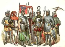 Escutcheons and hereditary coats of arms with eminent privileges attached is an honor derived from the ancient Germans. Where Germans did not inhabit, and where German customs were unknown, no such thing existed.[62] The usage of coats of arms in Poland was brought in by knights arriving from Silesia, Lusatia, Meissen, and Bohemia. Migrations from here were the most frequent, and the time period was the thirteenth and fourteenth centuries.[63] However, unlike other European chivalry, coats of arms were associated with Polish knights' clans' (genealogiae) names and war cries (godło), where heraldic devices came to be held in common by entire clans, fighting in regiments.[64][6][9] (Górecki 1992, pp. 183–185).