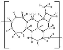 In polysilazanes, each silicon atom is bound to two nitrogen atoms and each nitrogen atom to at least two silicon atoms (three bonds to silicon atoms are also possible). If all remaining bonds are with hydrogen atoms, perhydropolysilazane [H2Si−NH]n results (proposed structure is shown to the right). In organopolysilazanes, at least one organic substituent is bound to the silicon atom. The amount and type of organic substituents have a predominant influence on the macro-molecular structure of polysilazanes.[3] Silazane copolymers are normally produced from ammonolyses of chlorosilane mixtures. In this chemical reaction, different chlorosilanes react at similar rates so that the monomers are statistically distributed in the copolymer.