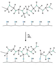 Taking advantage of their reaction with moisture and polar surfaces, polysilazanes are used as coating materials.[7] Many metals, glass, ceramics or plastics with OH groups on the surface are easily wetted by polysilazanes. Reaction of Si–N with OH leads to the formation of Si–O–metal bonds generating good adhesion of the coating to the substrate. The “free” surface of the coating can react with humidity thereby creating a siloxane-like structure with excellent “easy to clean” properties. TutoProm, an organopolysilazane-based product, is used by Deutsche Bahn on their carriages as an anti-graffiti coating. Beyond that, organopolysilazanes can be applied as high temperature coatings or anti-corrosion varnishes.