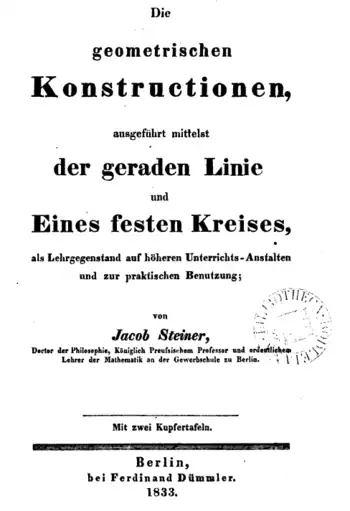 Showing that "all of Euclid" could be performed with straightedge and rusty compass is not the same as proving that all straightedge and compass constructions could be done with a straightedge and just a rusty compass. Such a proof would require the formalization of what a straightedge and compass could construct. This groundwork was provided by Jean Victor Poncelet in 1822, having been motivated by Mohr's work on the Mohr-Mascheroni theorem. He also conjectured and suggested a possible proof that a straightedge and rusty compass would be equivalent to a straightedge and compass, and moreover, the rusty compass need only be used once. The result that a straightedge and single circle with given centre is equivalent to a straightedge and compass was proved by Jakob Steiner in 1833.[3][1]
