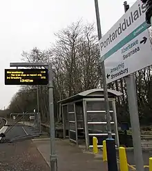 Pontarddulais is a request stop, whereby passengers have to give a hand signal to the approaching train driver to board or notify the guard when they board that they wish to alight from the train there.