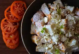 Popara (Cyrillic: попара, Greek: παπάρα, papara,[1] Turkish: papara[2]) is a dish made with bread. Typically the bread is old and has a thick crust, and is soaked in either hot tea, milk or water. Sugar, honey, butter, and cheese are often added. It is mostly made in Bulgaria, Greece, Serbia, Bosnia and Herzegovina, North Macedonia, Turkey and Montenegro.
