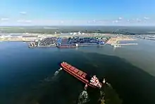 The project involves the construction of 4 warehouses with a total capacity of 780 thousand tonnes, and 2 docking facilities, as well as equipping the complex with high-tech equipment. Currently, more than 19 billion Rubles have been invested of the planned 27 billion Rubles, an artificial land plot has been created, and a docking facility has been built. The new coal terminal will be equipped with the most productive modern equipment supplied from Japan: two tandem railcar dumpers for innovative high-capacity wagons that allow the unloading of four 70-tonne wagons of coal in just 3 minutes,[10] two stokers, and four reclaimers with a capacity of 3,500 thousand tonnes per hour.[11]