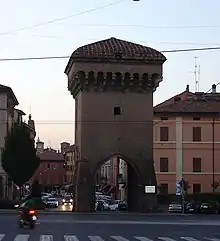 First erected in the second half of the 13th century, and rebuilt in the 15th century. The now isolated tower once was a machiocolated rampart in the city walls. The gate once stood beside the Savena Canal, which crossed the city and whose current fed hydraulic power to the city's cloth factories.[1] 44°29′08″N 11°20′54″E