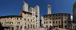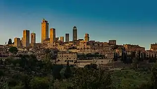 San Gimignano (Italian pronunciation: [san dʒimiɲˈɲaːno]) is a small walled medieval hill town in the province of Siena, Tuscany, north-central Italy. Known as the Town of Fine Towers, San Gimignano is famous for its medieval architecture, unique in the preservation of about a dozen of its tower houses,[3] which, with its hilltop setting and encircling walls, form "an unforgettable skyline".[4] Within the walls, the well-preserved buildings include notable examples of both Romanesque and Gothic architecture, with outstanding examples of secular buildings as well as churches. The Palazzo Comunale, the Collegiate Church and Church of Sant' Agostino contain frescos, including cycles dating from the 14th and 15th centuries.[4] The "Historic Centre of San Gimignano" is a UNESCO World Heritage Site.[4] The town also is known for saffron, the Golden Ham, pecorino cheese and its white wine, Vernaccia di San Gimignano, produced from the ancient variety of Vernaccia grape which is grown on the sandstone hillsides of the area.[5][6]